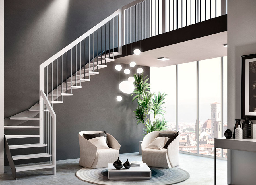 GRADINI IN ROVERE DECAPATO NERO STRUTTURA A FASCIA BIANCO GOFFRATO RINGHIERA VETRO EXTRACHIARO |